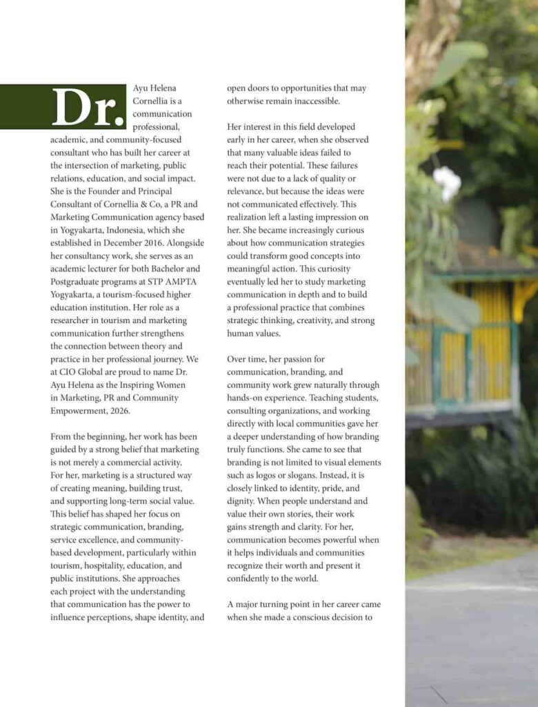 Dr. Ayu Helena Cornellia is a communication professional, academic, and community-focused consultant who has built her career at the intersection of marketing, public relations, education, and social impact. She is the Founder and Principal Consultant of Cornellia & Co, a PR and Marketing Communication agency based in Yogyakarta, Indonesia, which she established in December 2016. Alongside her consultancy work, she serves as an academic lecturer for both Bachelor and Postgraduate programs at STP AMPTA Yogyakarta, a tourism-focused higher education institution. Her role as a researcher in tourism and marketing communication further strengthens the connection between theory and practice in her professional journey. We at CIO Global are proud to name Dr. Ayu Helena as the Inspiring Women in Marketing, PR and Community Empowerment, 2026.